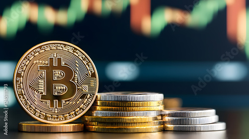 Bullrun crypto BTC, bull and many bitcoin gold coins, Bitcoin (BTC) coin with a bullish price chart in the background