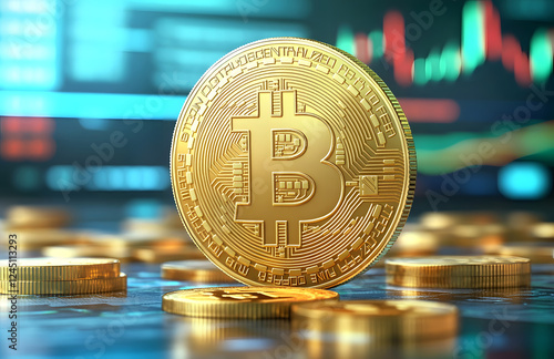 Bullrun crypto BTC, bull and many bitcoin gold coins, Bitcoin (BTC) coin with a bullish price chart in the background