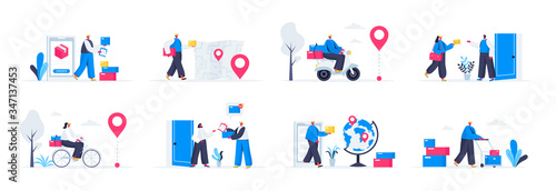 delivery, flat, concept, vector, illustration, people, character, cartoon, behaviour, scene, situation, act, action, set, collection, bundle, bike, online, order, courier, home, global, shipping, service, logistic, distribution, shop, cyberspace, mail carrier, store, carry, shipment, scooter, deliver, package, transportation, express, purchase, bicycle, route, parcel, business, fast, post, location, postal, quick, box