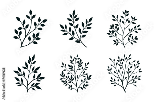 Bundle of six Vector Silhouettes of Tree Branches with Leaves. It Can be used for cards, posters, children's books, illustrations or other design projects.