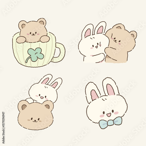 rabbit, rabbit, bear, baby animal, cute, animal, character, set, collection, friendship, hug, cuddle, hugs, mug, cup, clover, bow tie, peeking, duet, pair, sweet, playful, adorable, hand-drawn, doodle, soft, pastel, illustration, cartoon, minimalist, simple, love, affection, companionship, happiness, comfort, joy, gentle, peaceful, cosy, children, character, funny, face, animal