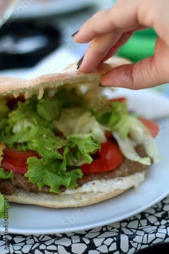 Burger in a flatbread bun with meat, lettuce, tomatoes and mayonnaise. Selective focus.
