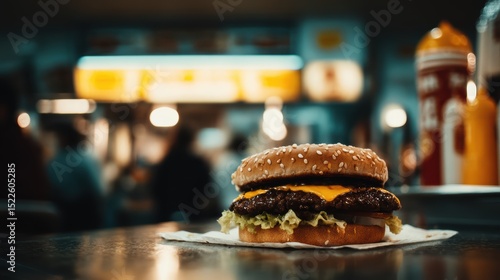 burger with cheddar and lettuce, blurry American diner background