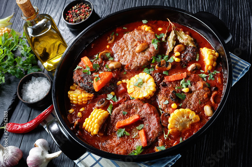 gravy, dish, mushroom, vegetable, patty, stew, kernel, red, hot, up high, wooden, topview, napkin, black, delicious, cookery, kitchen, ingredient, closeup, table, overhead, receipe, food, meat, beef, comfort food, parsley, dinner, background, mexican, american, lunch, homemade, served, cooked, corn, hamburger, garlic