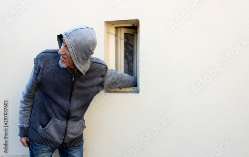 burglar, thief, robber, steal, stealing, criminal, window, breaking, through, house, property, suspicious, hood, portrait, hoodie, hooded, plan, suspect, behaviour, man, faceless, scene, mystery, arm, mysterious, break, into, spy, spying, delinquent, person, burglary, inside, wearing, concept, action, conceptual, copy, space, serious, watching, illustrative, wall, issue, shady