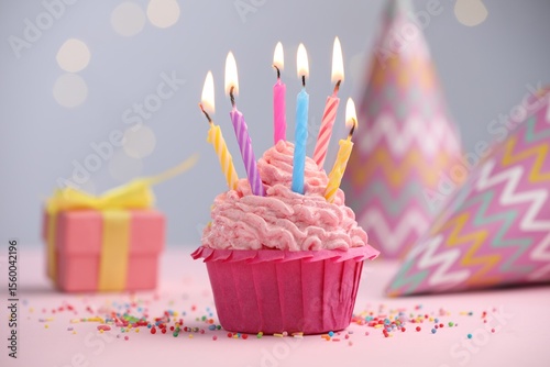 Burning candles in cupcake, sprinkles and party decor on table against blurred lights