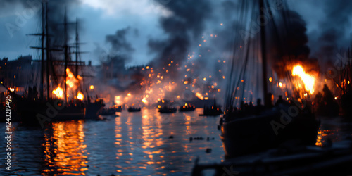 Burning Sailing Ships at Night