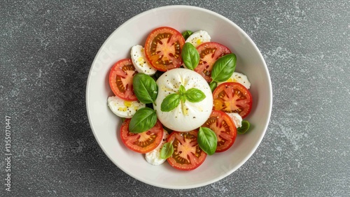 Burrata caprese salad atop gray table. Tomato slices, fresh basil, mozzarella, olive oil in bowl. Simple Italian cuisine. Fresh ingredients promote healthy eating.