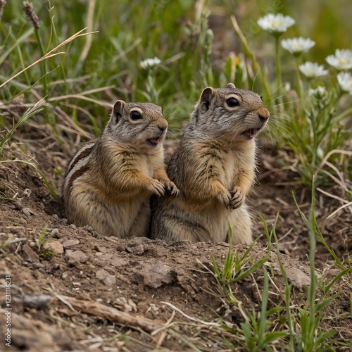 wildlife, nature, burrow, grass-land, wildflower, pine tree, playful, earth-tone, animal kingdom, nature scene, adventure, family life, natural beauty