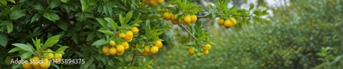 Bush with bright yellow berries amidst green leaves, blooming flowers Spring harvest vibes , spring, plant