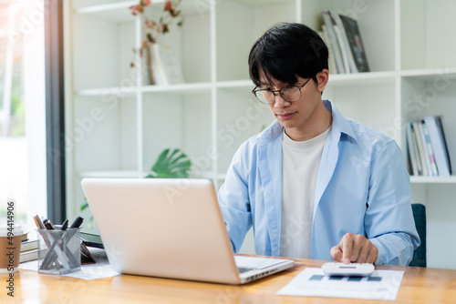 Business analyst concept the male accountant concentrating on sale detail while pressing his calculator