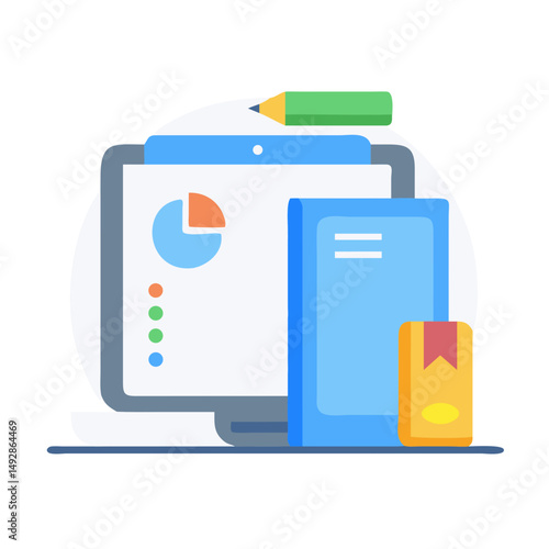 computer, screen, monitor, chart, diagram, book, crayons, stationery, graph, datum, analysis, office, work, study, education, learning, business, planning, report, information, vector, illustration, icon, blue, green, orange, white, grey, yellow, textbook, note, presentation, project, solution, strategy, progress, goal