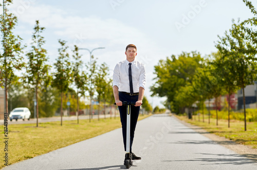 business and people and concept - young businessman riding electric scooter outdoors
