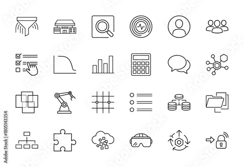 icon, vector, business, technology, set, line, datum, digital, modern, chart, graph, user, group, search, funnel, building, store, checklist, calculating machine, communication, network, robot, arm, puzzle, cloud, virtual, headset, security, lock, process, management, development, strategy, organisation, folder, document, finance, solution, abstract, pictogram, symbol, interface, simple