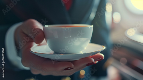 business class service. Serving coffee and tea in the first class. Premium in-flight service