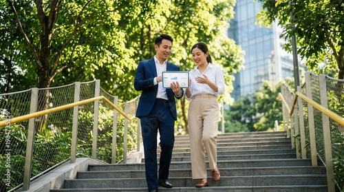 Business colleagues businessman and woman discussing work using a tablet on outdoor stairs.