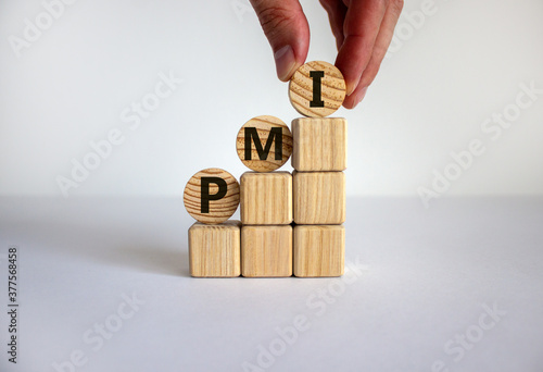 Business concept growth success process. Male hand. Wood blocks and circles with word 'PMI, purchasing manager index' stacking as step stair on white background, copy space.