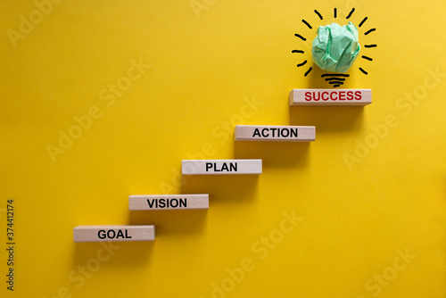 Business concept growth success process. Wood blocks stacking as step stair on yellow background, copy space. Words 'goal, vision, plan, action, success'.