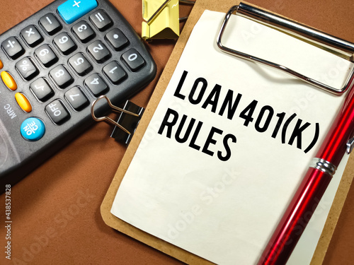 Business concept.Text LOAN 401(K) RULES with calculator,pen and paper clips on brown background.