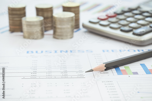 Business diagram on financial report with coins and calculatorBusiness diagram on financial report with coins and calculator
