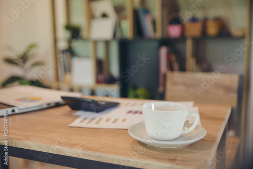 Business executive home office Desk Background concept. Business computer empty home office table with desktop laptop, notebook, coffee, calculator, book, annual, summary report, document, and paper