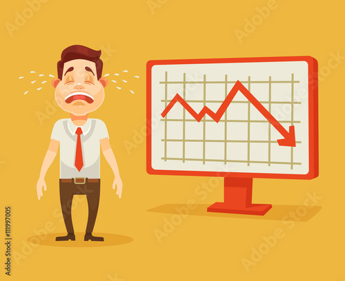 Business fail. Graph down. Crying businessman. Vector flat cartoon illustration