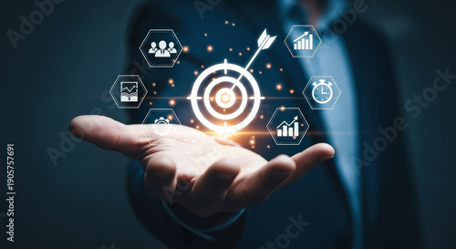 Business Goal Target on Hand Concept with Arrow Growth Diagram Success Strategy Teamwork Time Document Vision Mission Aim Objective Idea Solution