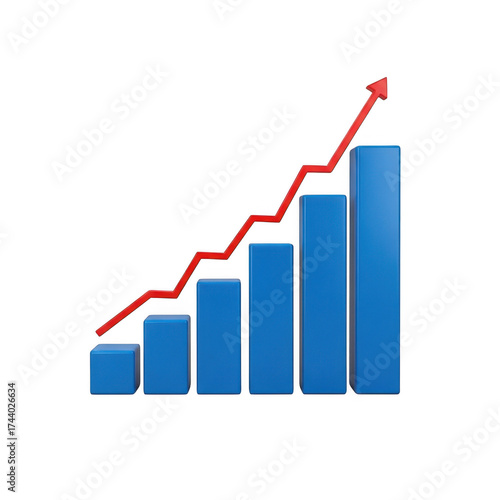 Business growth chart visualizes upward trend with red arrow and blue bars transparent background