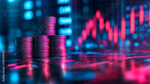 Business growth concept with a stack of rising coins, financial graphs in the background, and a clear space for text.