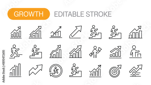 Business Growth Editable Stroke Line Icons Set with Charts and Progress Symbols