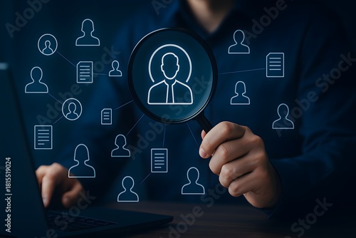 recruitment, human resources, magnifying glass, organization chart, blue background, job market, corporate culture