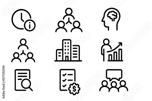 Business icons set featuring teamwork, analytics, and corporate growth symbols