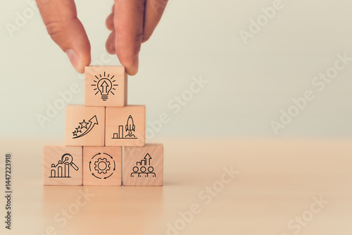 Business Innovation and Growth Strategy Concept. Wooden blocks with icons symbolizing innovation, data analysis, teamwork, process optimization and business growth. Strategic ideas successful launch.