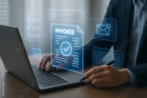Business invoice verification digital technology futuristic hologram billing approval financial receipt secure documents monitoring transaction report payment approval paperwork processing system