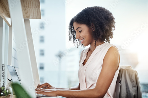 Business, laptop and black woman with startup success, workplace and connection with new project. Female professional, entrepreneur or freelancer with happiness, typing or website launch in an office