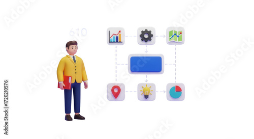 business, man, workflow, diagram, process, flowchart, strategy, planning, analysis, datum, graph, gear, map, location, idea, light bulb, pie chart, organisation, management, concept, digital, illustration, three-dimensional, cartoon, professional