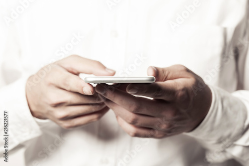 business man hand hold a mobile phone on the white background.