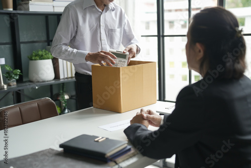 Business man sending resignation letter and packing Stuff Resign Depress or carrying business cardboard box Change of job or fired from company resign.