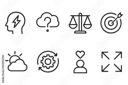 icon, set, business, strategy, line, outline, scale, target, cloud, head, gear, nubes, arrow, sun, silhouette, balance, idea, problem, solution, achievement, decision, growth, direction, sharpened, clarity, precision, adjustment, improvement, determination, progress, aspiration, expansion, success