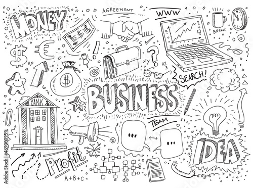 business, money, vector, doodle, illustration, drawing, hand, icon, signs, bank, dollar, euro, search, computer, profit, agreements, hand, shaking, bulb, idea, team, speech, cloud, arrow, smile, thinks, bag, goggles, time, clock, paper, office, building, break, hot drink, formula