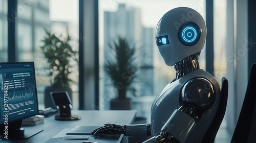 business office where AI-powered data tools assist in decision-making, while a chatbot offers solutions to everyday work problems,