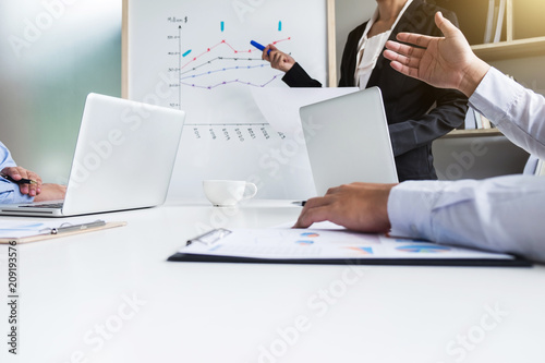 Business people are working in office, presentation in front of Whiteboard, business woman leader presentation to her colleagues and business strategy and pointing to the board
