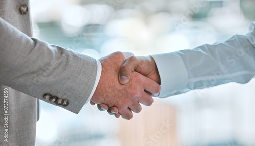Business people, closeup and shaking hands in agreement for funding, meeting or team partnership. Collaboration, offer and investment banker greeting manager for financial advice and negotiation deal