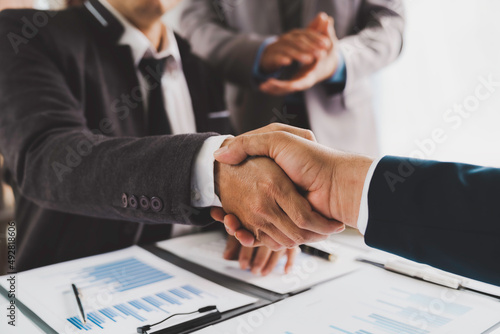 Business people shaking hands, finishing up meeting, business handshake for successful of investment deal, teamwork and partnership concept.