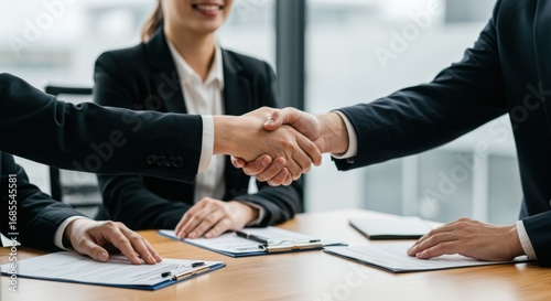 handshake, business, deal, agreements, meeting, office, people, team, success, contract, corporate, collaboration, professional, partnership, negotiation, communication, job, work, career, finance, suit, table, document, paper, desk, indoor, closeup, hand, person, woman, man, workspace, strategy, planning, together, achievement, cooperation, enterprise, executive, formal, gesture, management, uniform, window