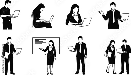 Business people silhouettes, office work poses, corporate team illustration, laptop usage, presentation scene, formal attire, professional vector design