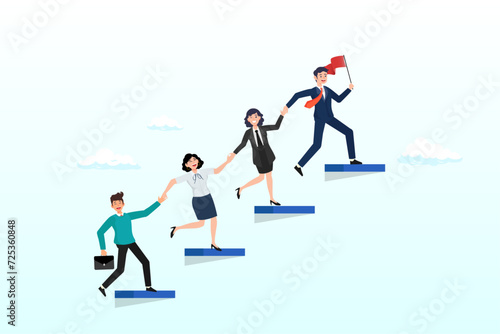 Business people team up holding hand help climb up stair, team support help success, teamwork to progress and success together, company growth step or employee development, team achievement (Vector)