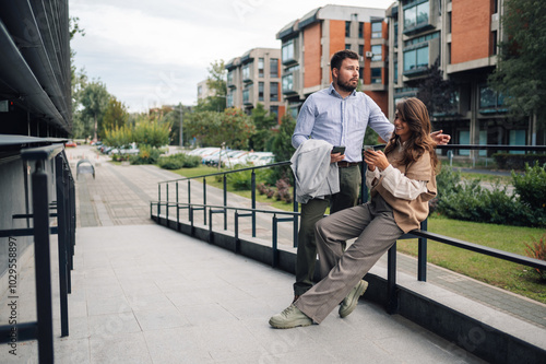 business, people, smartphone, office, building, technology, communication, mobile, phone, cyberspace, online, social, media, work, career, professional, colleague, break, relaxing, conversation, city, urban, outdoors, modern, lifestyle, success, connection, wireless, device, browsing, scrolling, texting, man, woman, together, partnership, teamwork, businesswoman, businessman, entrepreneur, networking, digital, city landscape, collaboration, meeting, discussion