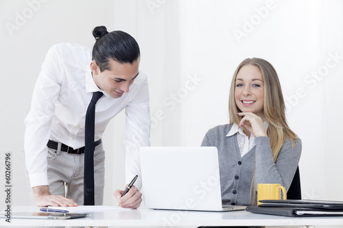 business, people, office, couple, desk, laptop, working, white, computer, businessman, young, businesswoman, technology, woman, adult, using, 2, isolated, table, suit, man, success, sitting, background, teamwork, female, team, happy, male, cyberspace, men at work, executive, corporate, cooperation, work, job, career, meeting, communication