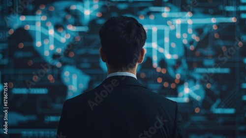 Business professional analyzing a global network data map, highlighting international connections and technology-driven insights.